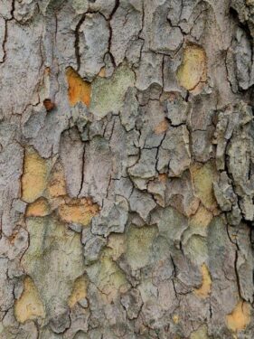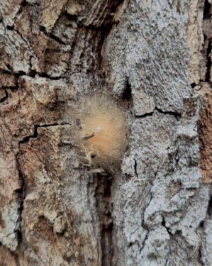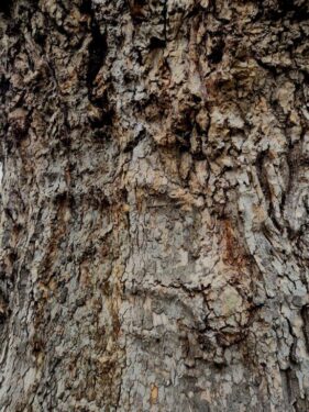 The larger trees showed clearly the unreliability of bark as an identification feature, that on the primary trunk being grey and deeply fissured, here with a spider’s nest, but on the younger stems, the more expected flaking mosaic of colour.