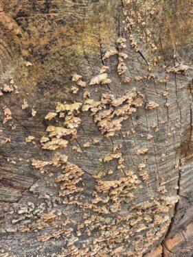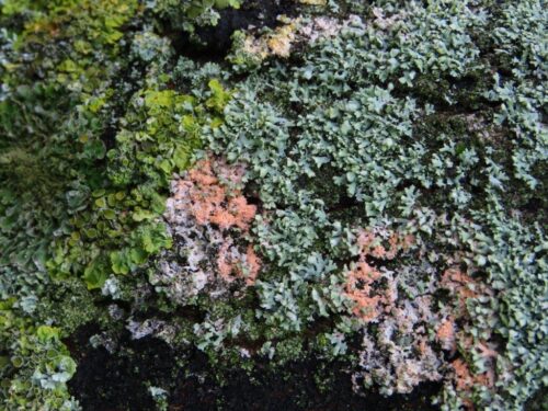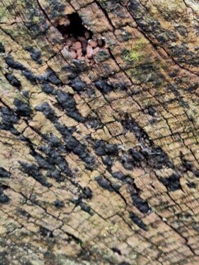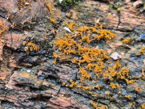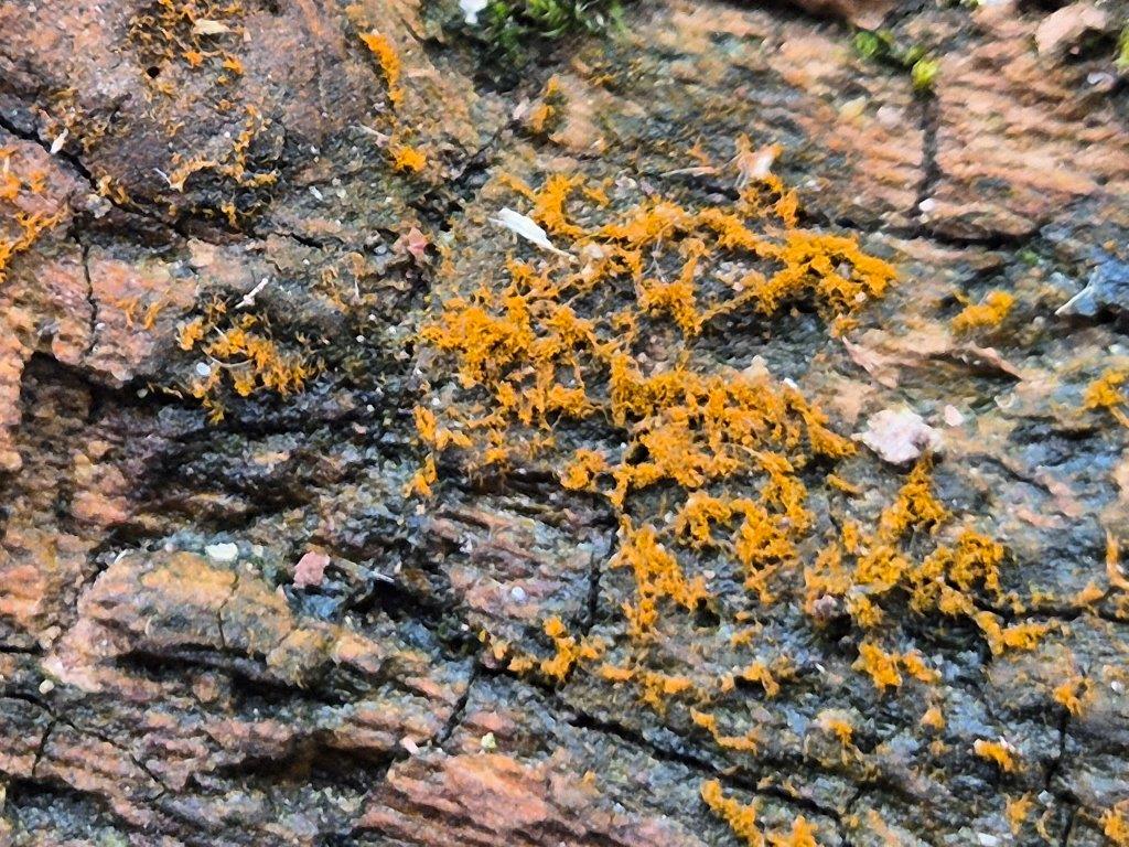 And those trees that had reached the end of their life were being recycled naturally by fungi of several sorts, interspersed with the orange tufts of a terrestrial alga, Trentepohlia.