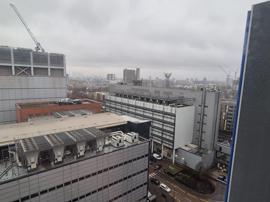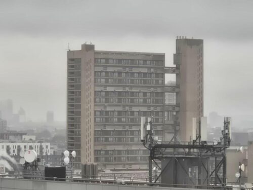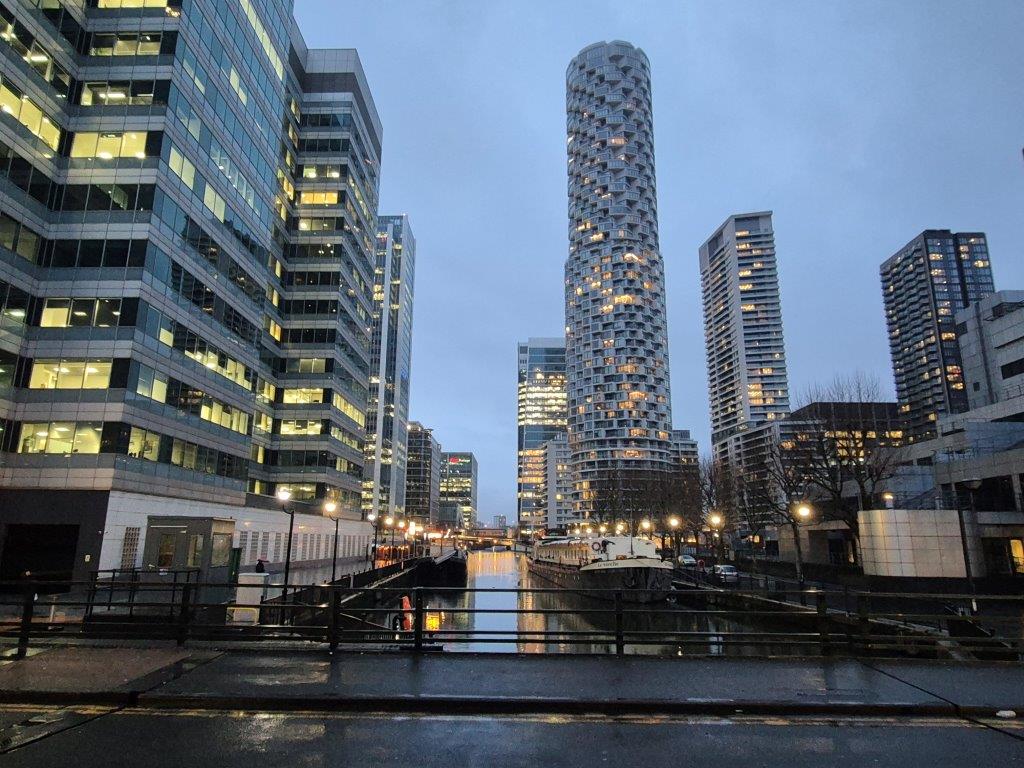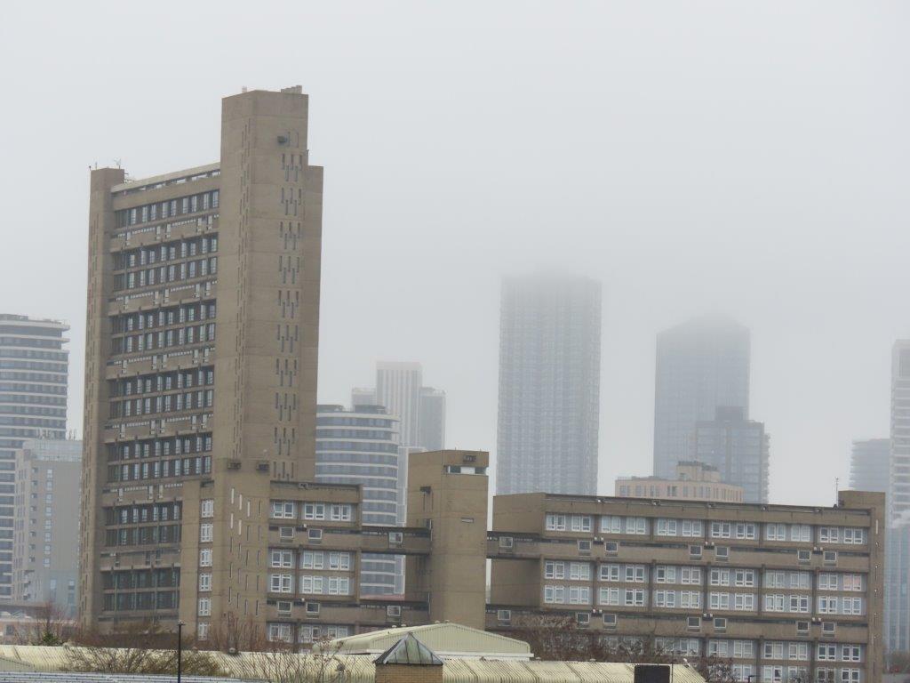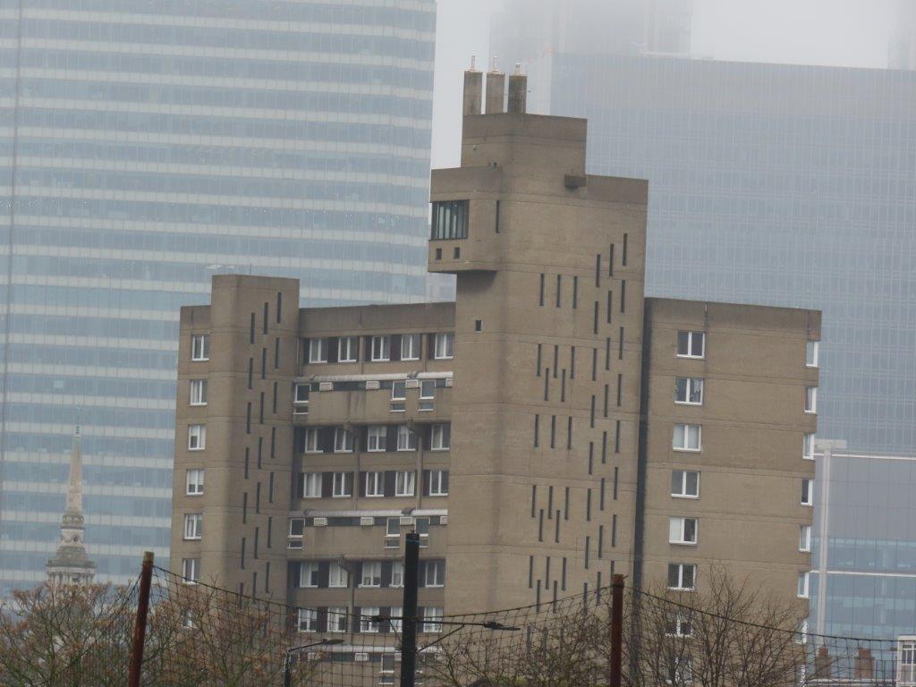 By the time lunch was over, it was really quite unpleasant weatherwise, so we headed by bus to Docklands, and our hotel, a very pleasant (and extremely reasonably priced) high-rise Travelodge right next to Bow Creek. Up we went to floor 13, and we were thrilled to see the view over Poplar to the City, with the beautiful Brutalist edifice of Balfron Tower, one of the Goldfinger-prints on the London landscape, taking centre stage!