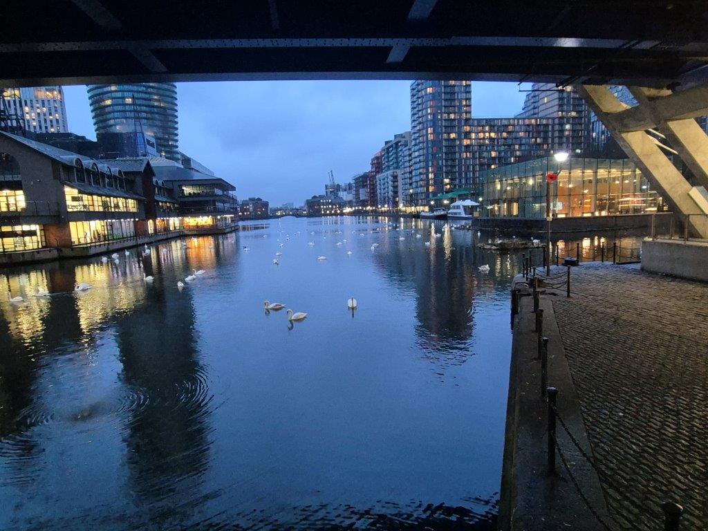 One of the features of the site is the Rolling Bridge, a novel, unique design that will ultimately allow the water access once again to and from the Dock. Cleverly counterweighted, it runs on a wavy track and can easily be operated single-handedly (apparently)!