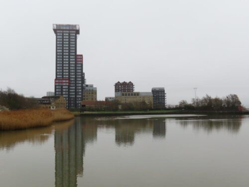 Next morning, it was at least dry although no less gloomy than previously. Down at the Bow Creek nature reserve, a Grey Heron and several Shelducks were feeding happily in the shadow of looming hi-rise, as the song of Cetti’s Warblers echoed around the concrete canyons.