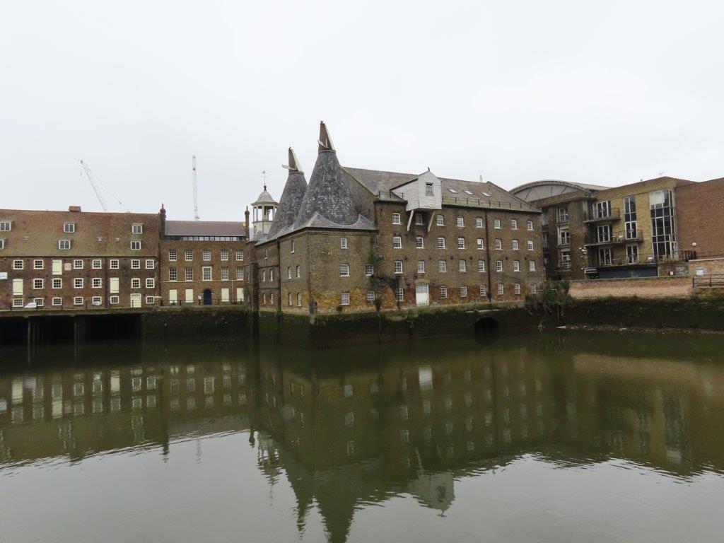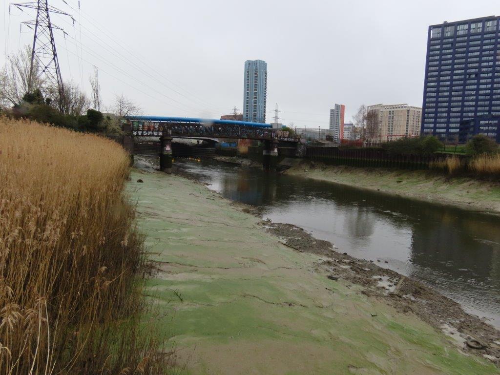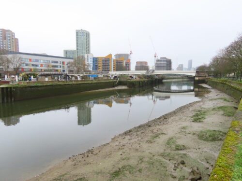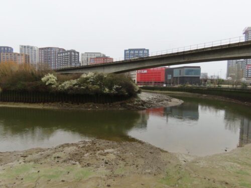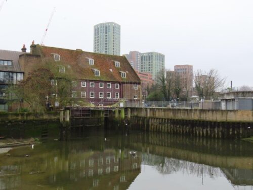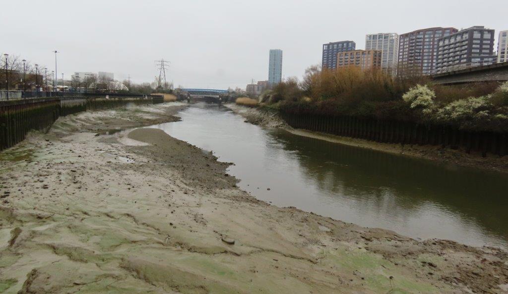 From this point the river becomes more braided and corralled into locks and mill pools of Three Mills Island, a beautifully preserved series of 18th century tide-mills, with Cormorants roosting atop the turrets.