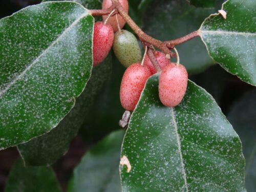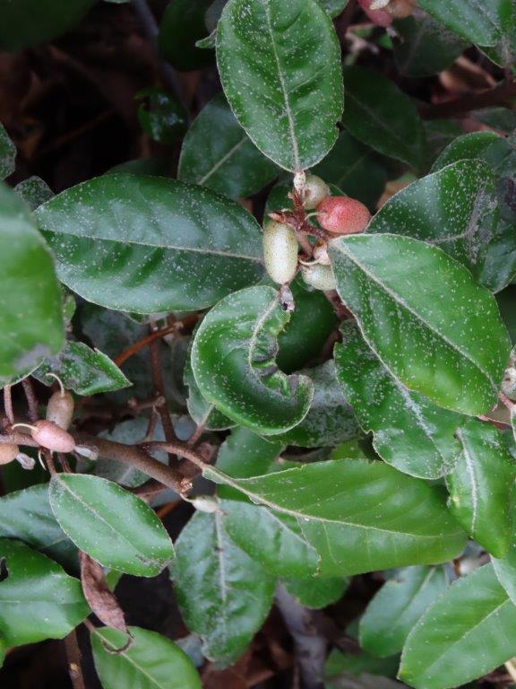 Approaching the entrance, Elaeagnus x submacrophylla was in full fruit, while some of its leaves were galled and distorted, probably attacked by the Elaeagnus Sucker psyllid Cacopsylla fulguralis, originally from Japan but now spreading widely in the south of England.