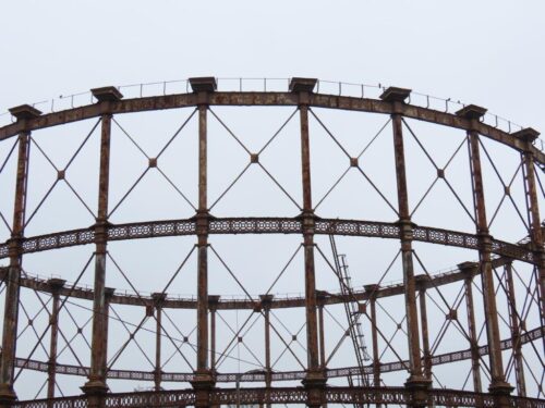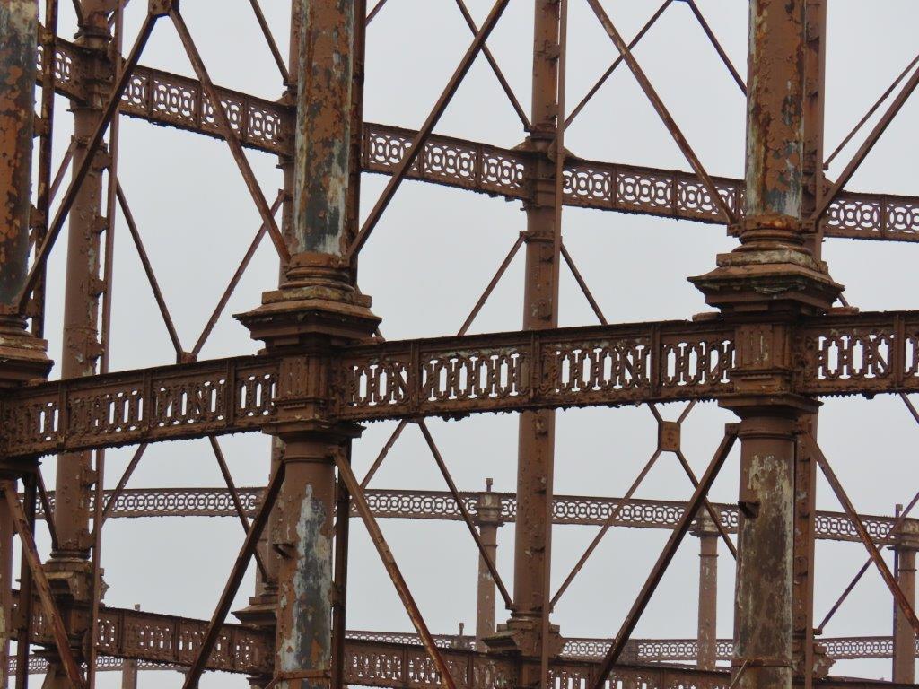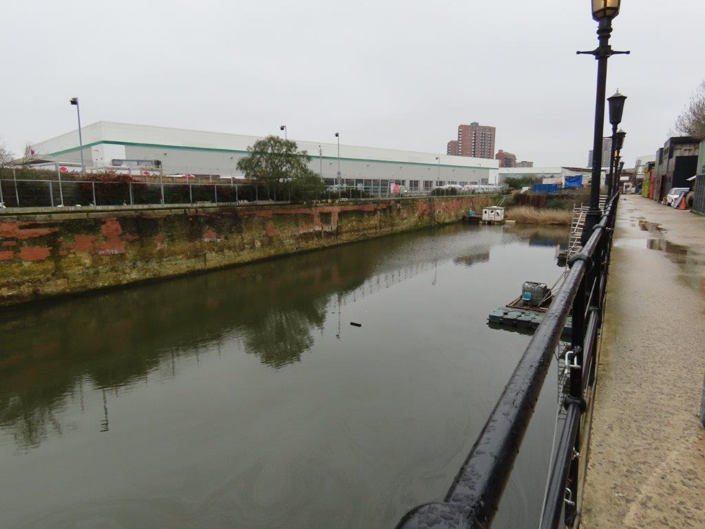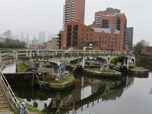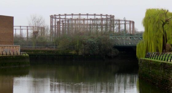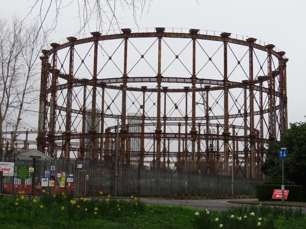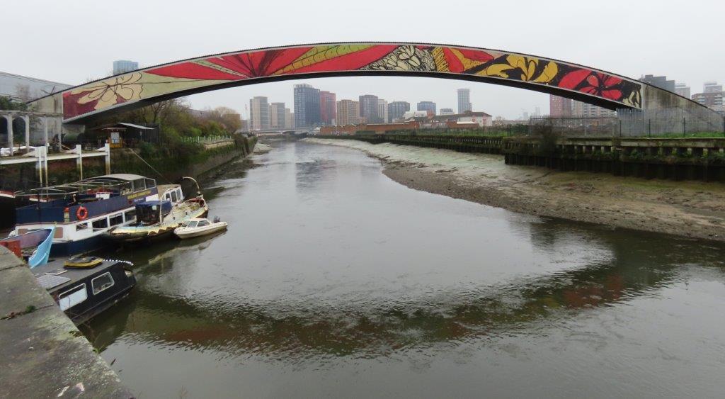 Looking back downstream, the Balfron Tower loomed large in the landscape, while in the other direction appeared the equally remarkable sculptural skeletons of the old gasometers of the Bromley-by-Bow Gas Works: