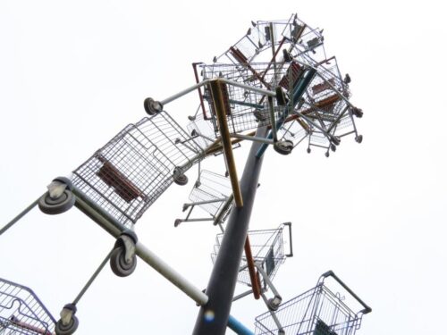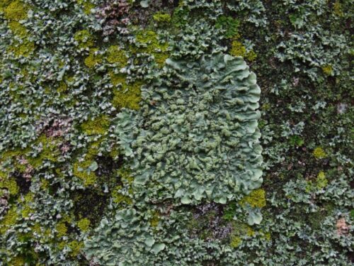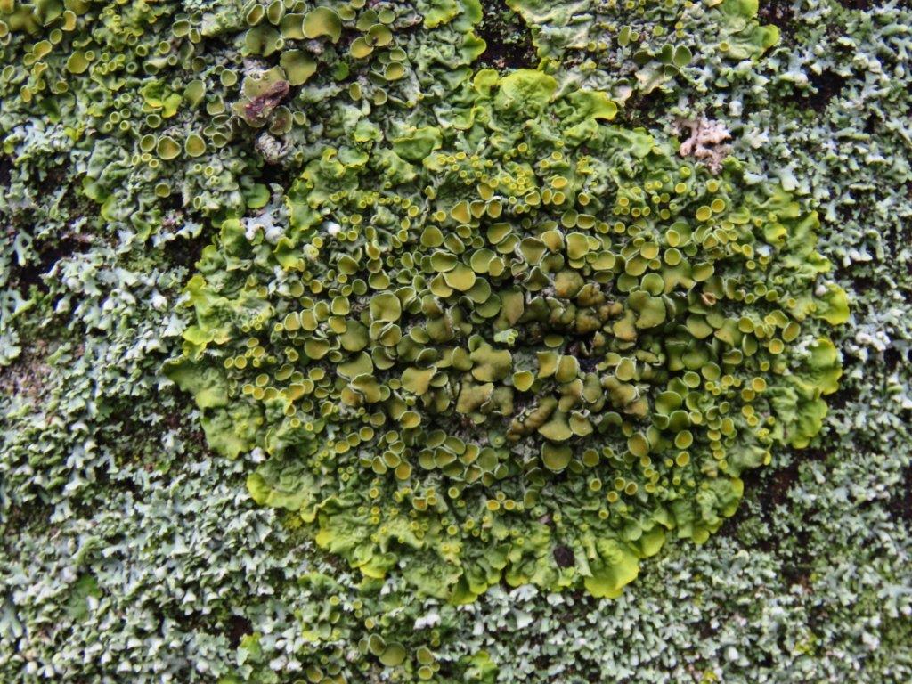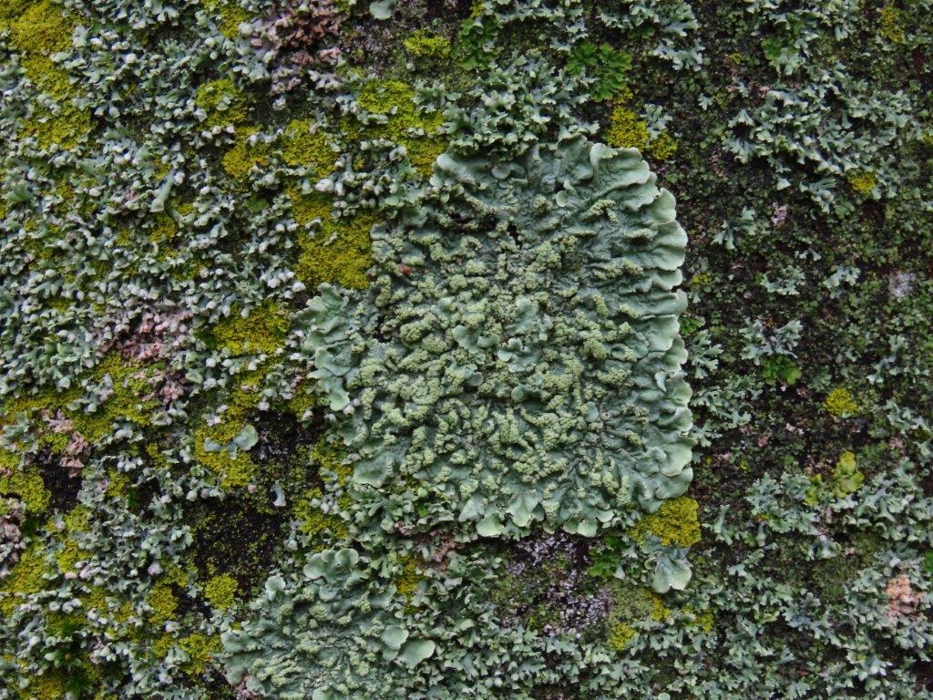As we approached Stratford, there were some interesting sculptures forming The Line public art trail, including a double-helix of shopping trolleys, and several trees with abundant lichens on their trunks, including Flavoparmelia caperata and (rather green) Sunburst Lichen, together with orange patches of the parasitic lichenicolous fungus Erythricium aurantiacum.