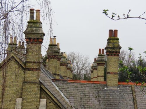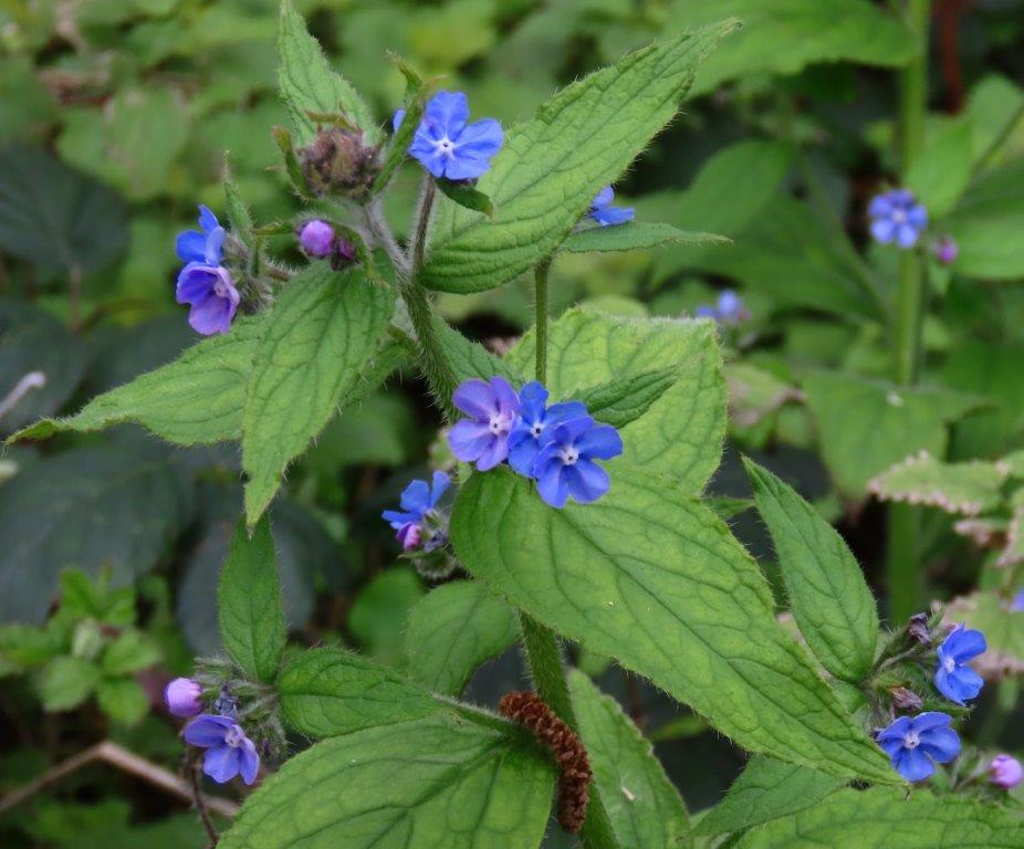 And so onto the Greenway, a raised walkway on the embankment formed by the Northern Outfall Sewer. Here there was Green Alkanet in good flower, its blooming brought forward no doubt by the urban heat-island effect, fruiting Old Man’s Beard, the Pumping Station from a different angle (we really must try and visit on one of its open days!), and the remarkable row of listed cottages built for the workforce in 1865.