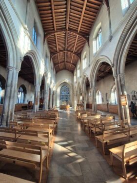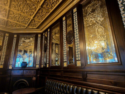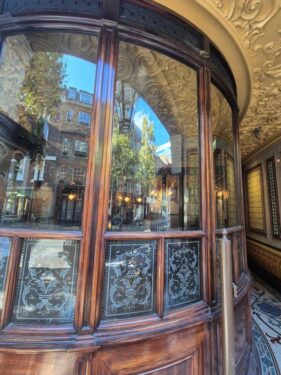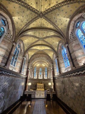 But the ornamentation of the Fitzroy Tavern paled into insignificance compared with the opulence of the main reason for us visiting the area. The site of the old Middlesex Hospital has now been redeveloped into luxury high-rise, with some attractive public space, but tucked in the middle is the sole survivors from former days, Fitzrovia Chapel, now restored and fairly recently opened to visitors.