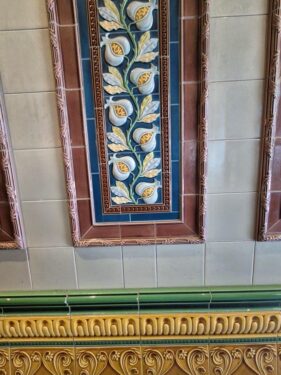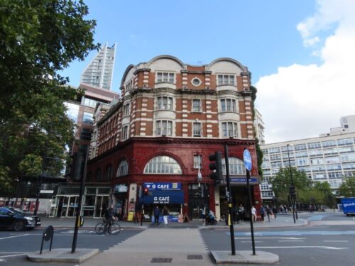 The tube station itself is also classic, one of the red-tiled originals designed by Leslie Green, now sporting a green wall on its back side: