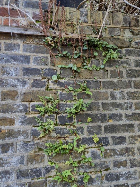 And then of course the green spaces that we always seek out. Around the backwoods of the Cinema Museum, it felt like nothing could intrude on the peace and quiet, remarkably just 2km from Charing Cross, the usually stated centrepoint of London. Buddleia was springing from the margins, Shaggy Soldier from the cracks in the pavement, and in one cracked wall, a seepage colony of ferns and Wall Pennywort (or Navelwort). Typically found in the westerly fringes of the UK, just two localities of the latter are shown in Greater London on the NBN Atlas, both north of the river.