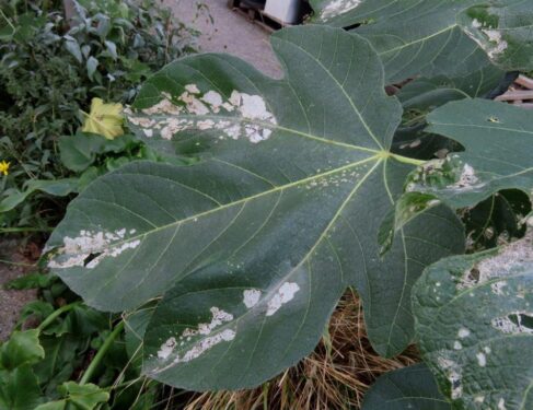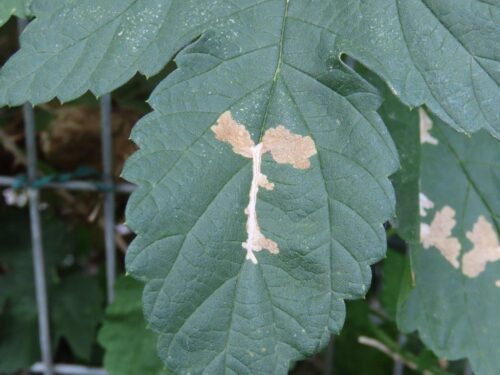 In the allotments, signs of micromoths: the leaves of Figs bore the scars of the Fig-leaf Skeletonizer and scrambling Hops with blotches of the Hop Beauty, another species not shown from Greater London on the NBN Atlas: