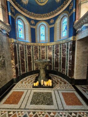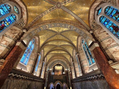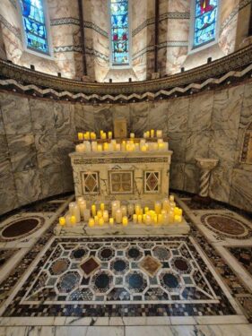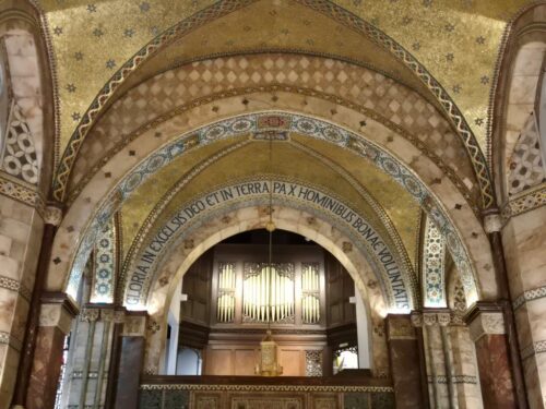Rather unprepossessing from the outside, stepping into that gilded space was like being transported to Italy, without the crowds. Built in the latter years of the 19th century, its Italianate interior is clad with almost Byzantine mosaics and marble, vibrant in the flickering candlelight.