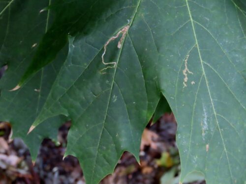 The street trees too were interesting, including profusely fruiting Pride-of-India Kolreuteria paniculata and Honey Locust Gleditsia triacanthos, with long purple-blotched pods, as well as Norway Maple, its leaves bearing the mines of the micromoth Stigmella aceris: