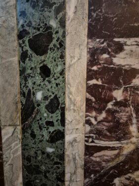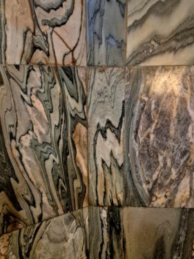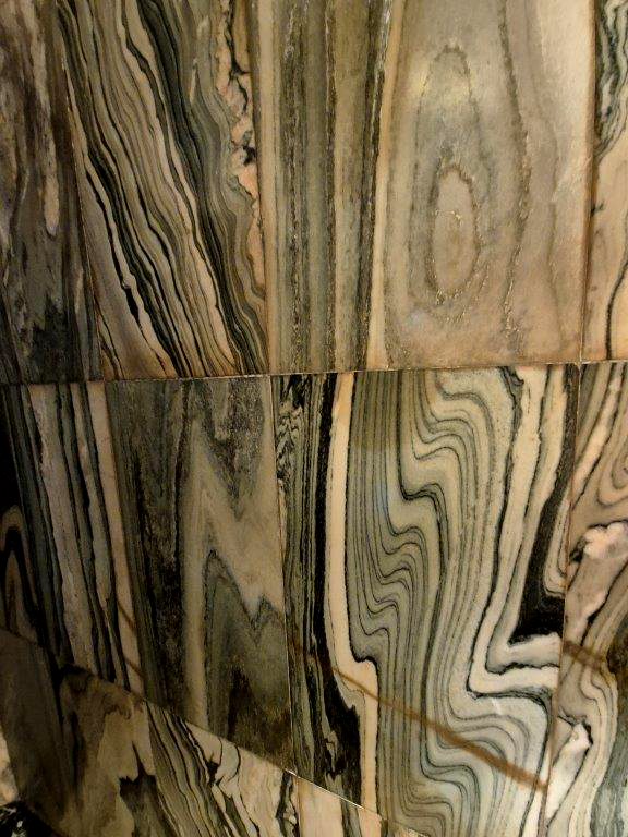 Marble features everywhere, but most remarkably in the wall panels that showcase the inner patterns and colours of the different forms. You can see anything in them, but for me the top two are as different as the fire at the heart of a John Martin dramatic landscape and the Great Wave graphic Japanese art of Hokusai:
