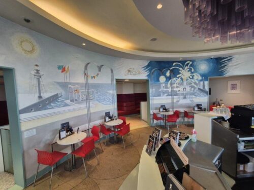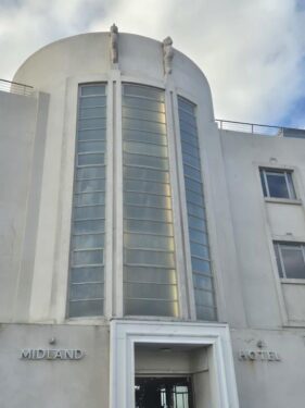 … as we walked the short distance to our hotel, the Midland, the whole reason we planned this short break. It all goes back to our visit to Dulwich Picture Gallery last May to see the Tirzah Garwood exhibition. A few days later Jude was reading a book on Seaside Architecture, where she came across this hotel and the fact that shortly after it was built in the 1930s, Tirzah and her husband Eric Ravilious had painted a mural therein. Unfortunately, the mural soon fell off the wall, and indeed the hotel fell into disrepair in the post-war period. Fortunately the building was rescued, revived and reopened in 2008, and a mural inspired by the original recreated for the filming of an episode of Agatha Christie’s Poirot: we just knew we had to visit, and we were not disappointed!