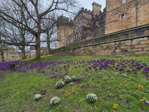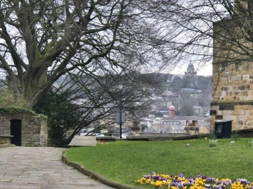 Down the hill, past the Castle and more banks of flowering bulbs, we headed into town, dodging the worst of the rain in a café and charity shops.