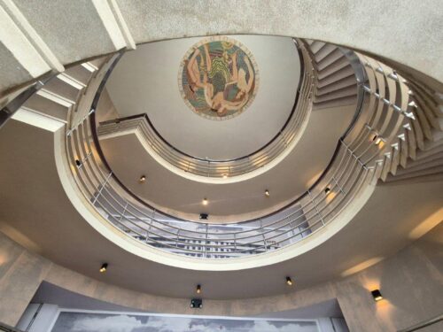 From the outside it is a classic Art Deco building, designed by Oliver Hill, whose work we are familiar with from the seafront at Frinton. And from the outset the artistic touches are apparent, including two seahorse sculptures over the entrance by Eric Gill.