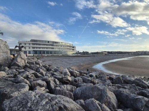 We could easily have spent the whole afternoon sipping wine in the Rotunda, but it was sunny and the prom and stone jetty were just out there. So out we went, for wonderful views of the hotel, and as the tide was in, just a few birds including Great Crested Grebes fishing and Redshanks and Turnstones roosting on the beach.