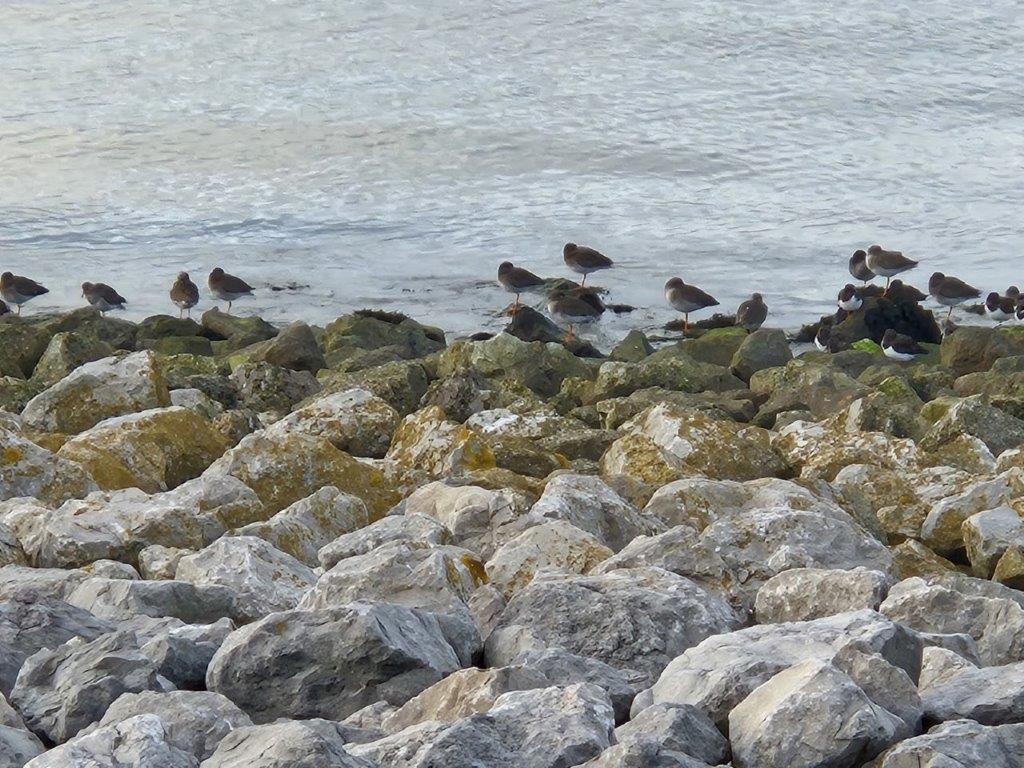 We could easily have spent the whole afternoon sipping wine in the Rotunda, but it was sunny and the prom and stone jetty were just out there. So out we went, for wonderful views of the hotel, and as the tide was in, just a few birds including Great Crested Grebes fishing and Redshanks and Turnstones roosting on the beach.