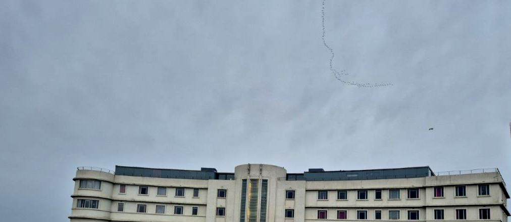 As we left the hotel, yelping overhead alerted us to a skein of Pink-footed Geese heading south, in a formation that was reflected in the flocks on the promenade fence: