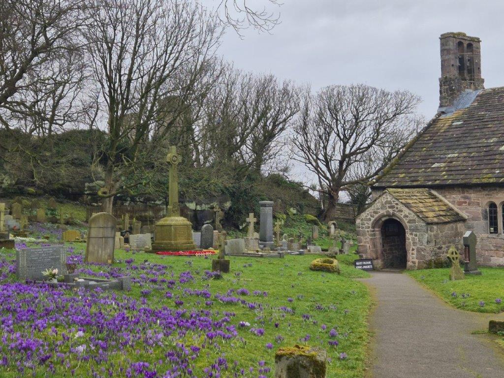 A short walk past walls dripping in spleenworts brought us first to St Peter’s Church, its churchyard filled with flowering crocuses and running down to the cliff slopes.