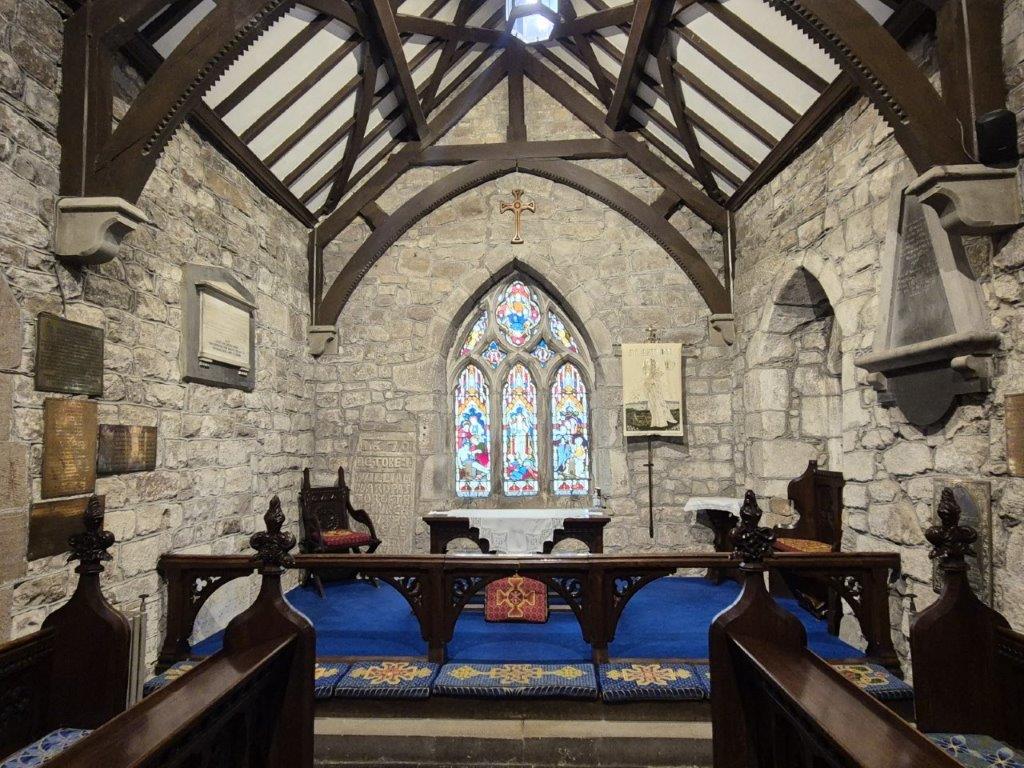 Then perched on the rocky knoll above the church was St Patrick’s Chapel, now ruined. From the 8th century, it postdates the founding of the church but predates the bulk of the present church building. Despite their exposed location, battered by wind, water and salt, the rocks and walls are still encrusted with lichens and wreathed in ferns.