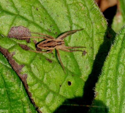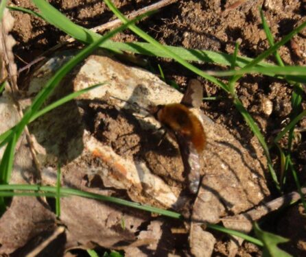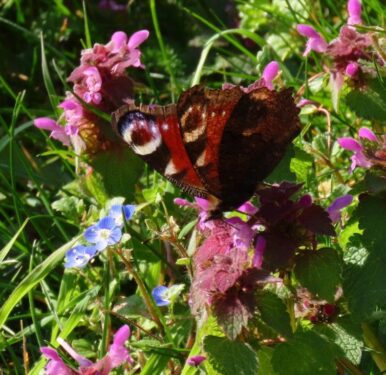 In the afternoon heat, the churchyard was buzzing with life. Patches of Red Dead-nettles, Primroses and Sweet Violets were in full bloom, attracting Peacock butterflies, while Brimstones and Dark-edged Beeflies were everywhere, and Nursery-web Spiders were out basking on many a leaf.