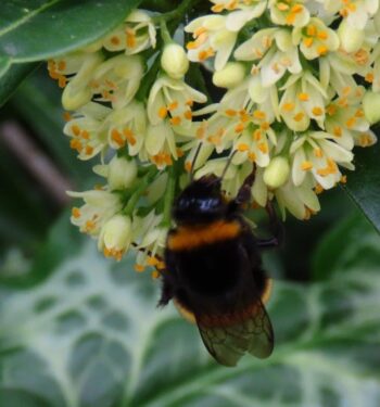 After the dampening, it took the insects a while to become active, but the still warmth coaxed a few out. Two plants are the superstar attractors at this moment. Firstly, there is Skimmia, each plant producing a pool of sublime scent in the still, moist air, attractive to us, but also crucially also to pollinators, especially bumblebees and blowflies.