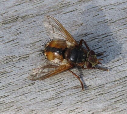 … but the specific identity of tachinid parasite-flies is more difficult to be sure of. The large ones with orange sides ‘used to be’ Tachina fera, but another pretty much identical species T. magnicornis has arrived recently in the UK, so we cannot now be so certain.
