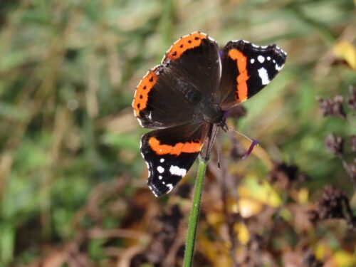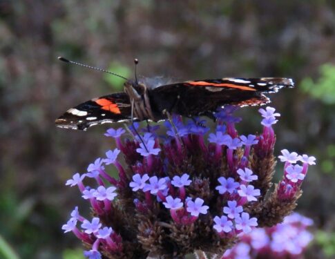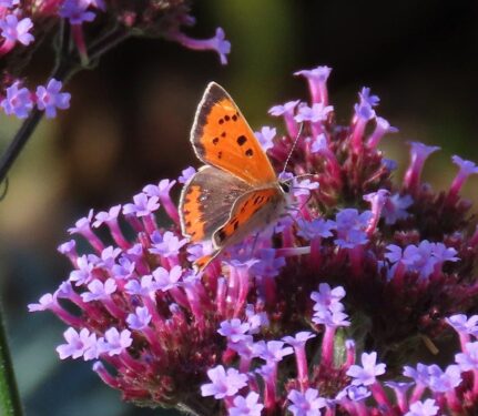 Late season butterflies, especially Red Admirals and Commas feeding up before hibernation, were still on the wing with a surprisingly late, newly emerged Small Copper, nectaring especially on Verbena bonariensis.