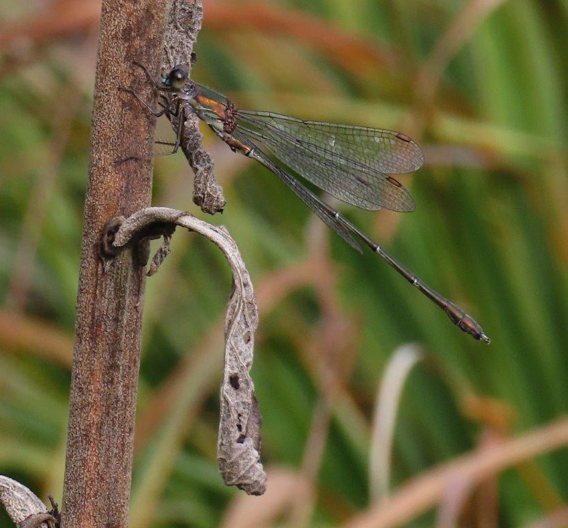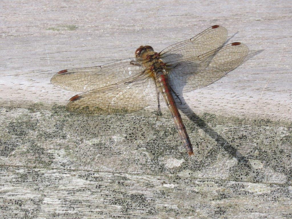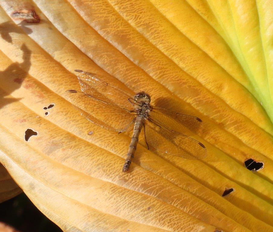 And sharing the aquatic immature stage of dragons and damsels, although as larvae instead of nymphs, a caddis-fly found camouflage among the browning poolside vegetation. These are tricky to identify, but this is one of the many, quite similar, Limnephilus species.