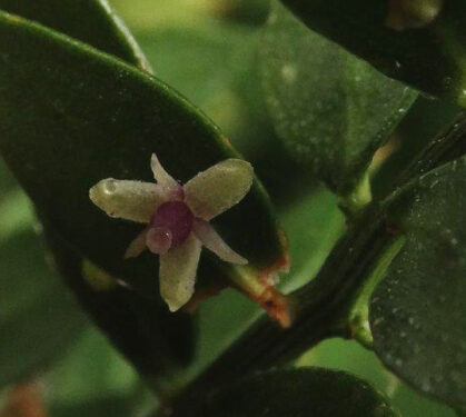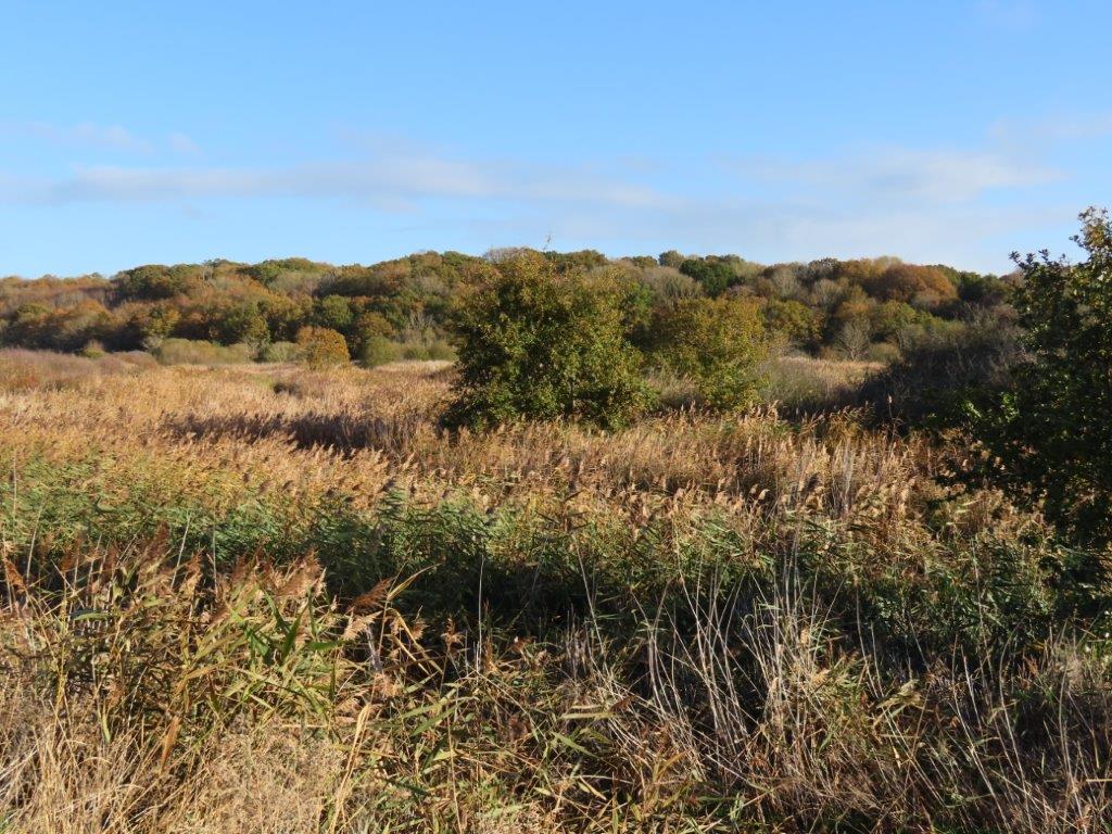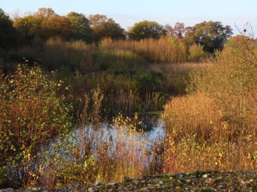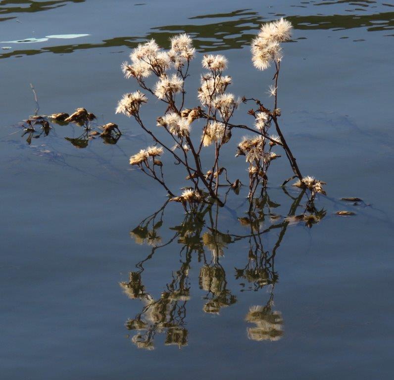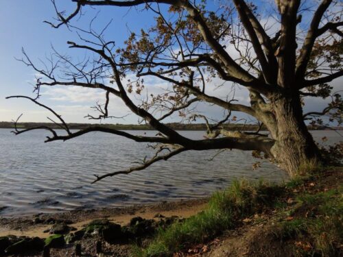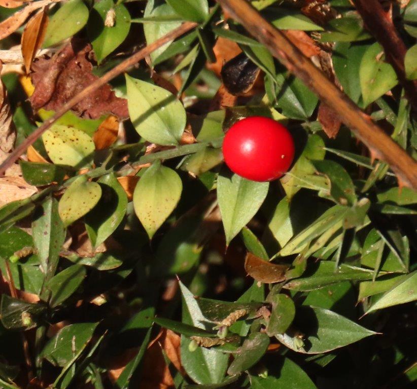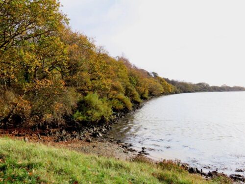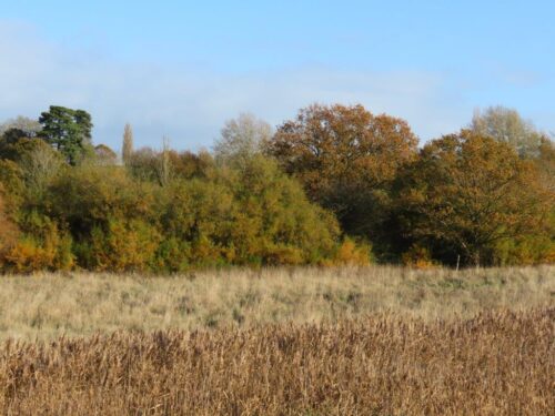 Starting upstream, we made a diversion into Wivenhoe Wood, autumn leaves still turning on the branches, others crackling underfoot as we looked at one of the few Butchers’-broom plants in the wood. With careful searching we managed to find one opened flower, a month or two ahead of the expected time.