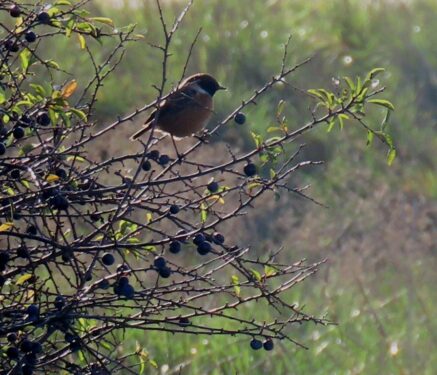 Around Ferry Marsh, the reedbeds swished in the wind, a psithurism seemingly designed to hide the contact calls of any reedbed birds. But along the sea wall, there was Blackthorn covered in ripe sloes and a lovely male Stonechat showed well, albeit suffering from the aggressive attentions of a territorial Robin, while Teals dabbled in the shallows among to equally copiously fruiting Sea Asters.