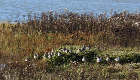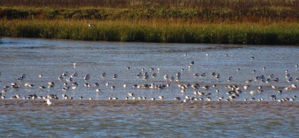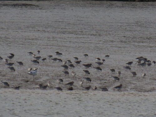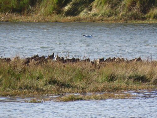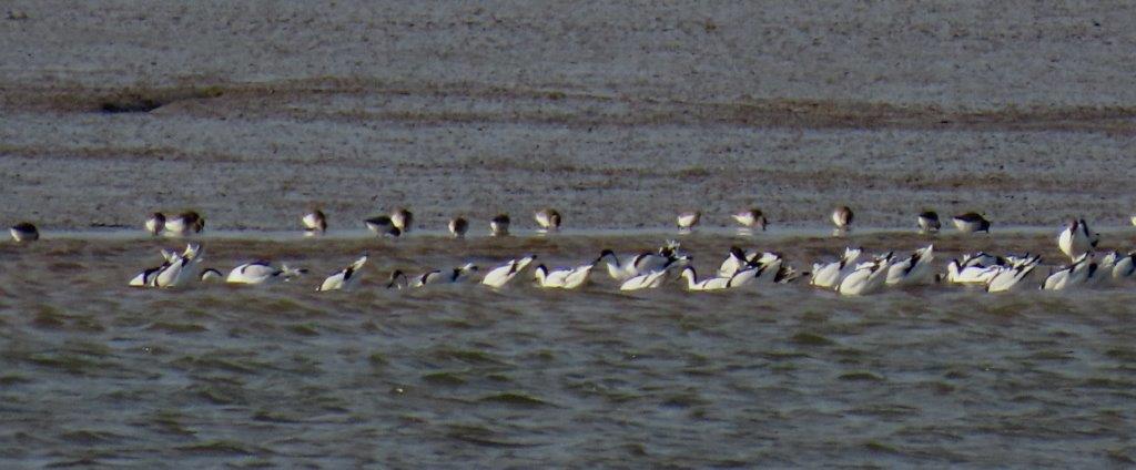 … and by the time we reached our lunch spot, the mudflats were starting to appear, covered in hungry feeding waders (Curlews, Black-tailed Godwits, Grey Plovers, Knots, Redshanks and Dunlins) along with Avocets, Wigeons and Brent Geese in the shallows. In fact the surge had done us a favour, meaning that the water birds were in better light than if we had seen them when we should have.