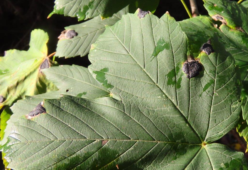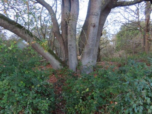 Magnificent boundary pollards and coppice stools, more galls and basking insects, Sycamore Tar-spot fungus, signs of Dutch Elm Disease and some huge Butchers’-brooms, these with still a few red berries from last winter’s flowers…