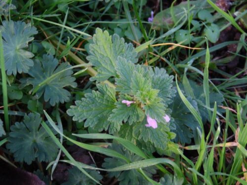 The few areas of permanent grass on our route had Daisies and Dandelions sparkling sparsely on them, together with Common Knapweed and Oxeye Daisy as a distant memory of the summer long gone, and Sweet Violet, the promise of spring. Along the fringes of the recreation area, Hedgerow Crane’s-bill was a new species for our NYPH list, as was Cut-leaved Dead-nettle, never very common in these parts, and growing alongside its more familiar relative, Red Dead-nettle, with more shallowly divided leaves and larger, darker flowers.