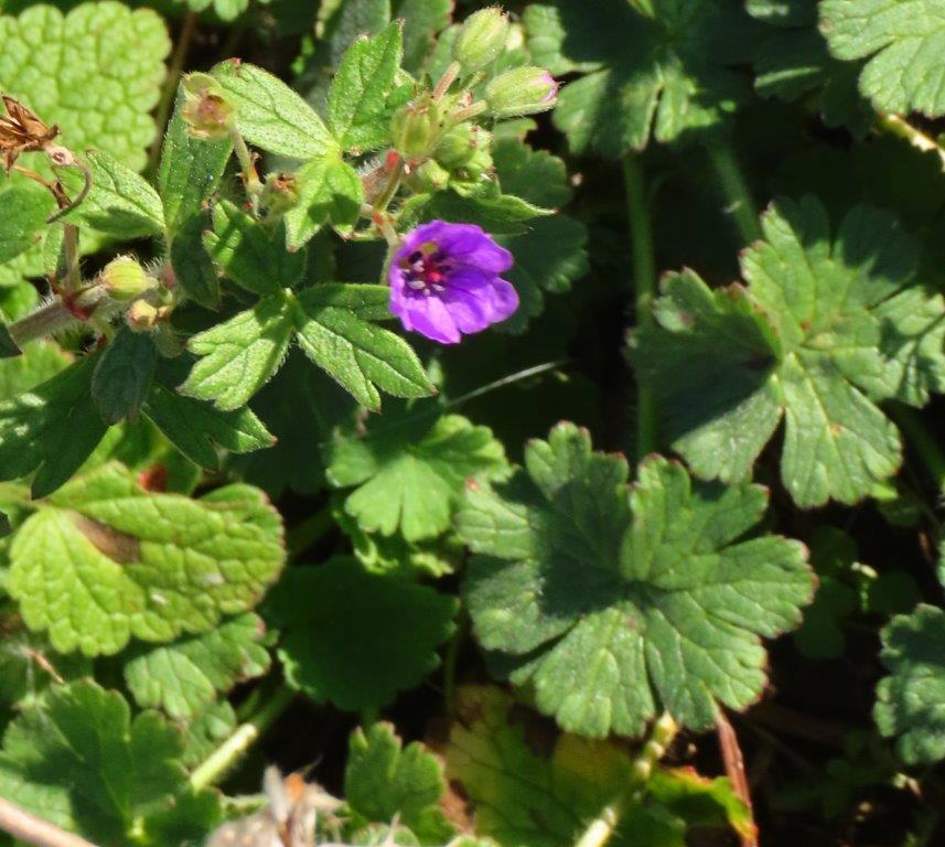 The few areas of permanent grass on our route had Daisies and Dandelions sparkling sparsely on them, together with Common Knapweed and Oxeye Daisy as a distant memory of the summer long gone, and Sweet Violet, the promise of spring. Along the fringes of the recreation area, Hedgerow Crane’s-bill was a new species for our NYPH list, as was Cut-leaved Dead-nettle, never very common in these parts, and growing alongside its more familiar relative, Red Dead-nettle, with more shallowly divided leaves and larger, darker flowers.
